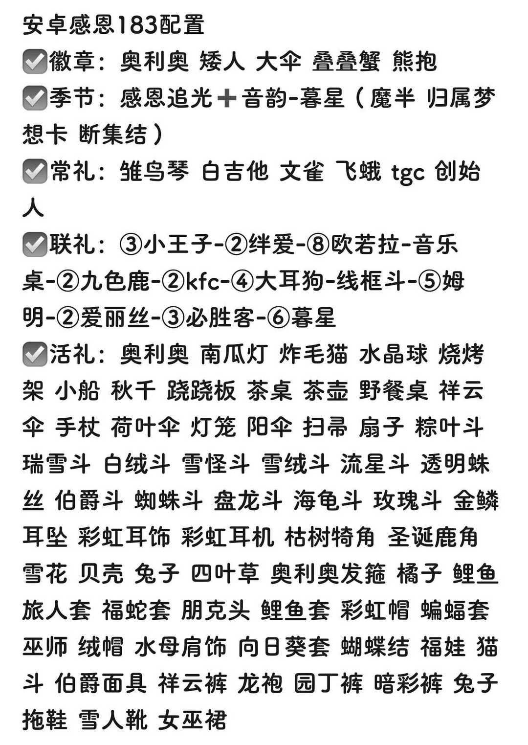礼包:(不瑕绝版不瑕热门,详情放不下,具体放截图了)③小王子-②绊爱-⑧欧若拉-音 乐桌-②九色鹿-②kfc-④大耳狗-线框斗-⑤姆明-②爱丽丝-③必胜客-⑥暮星