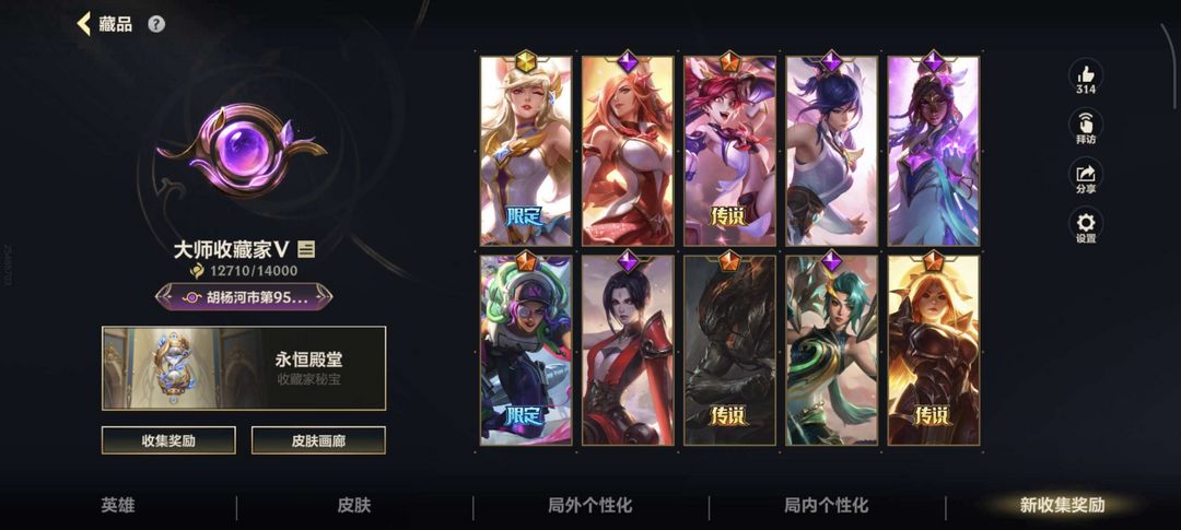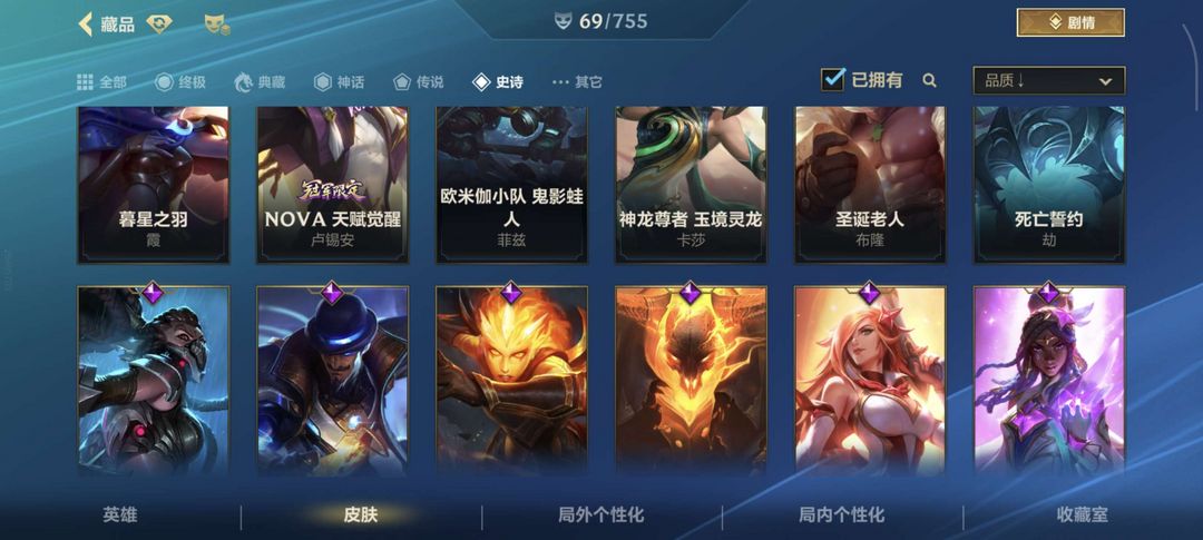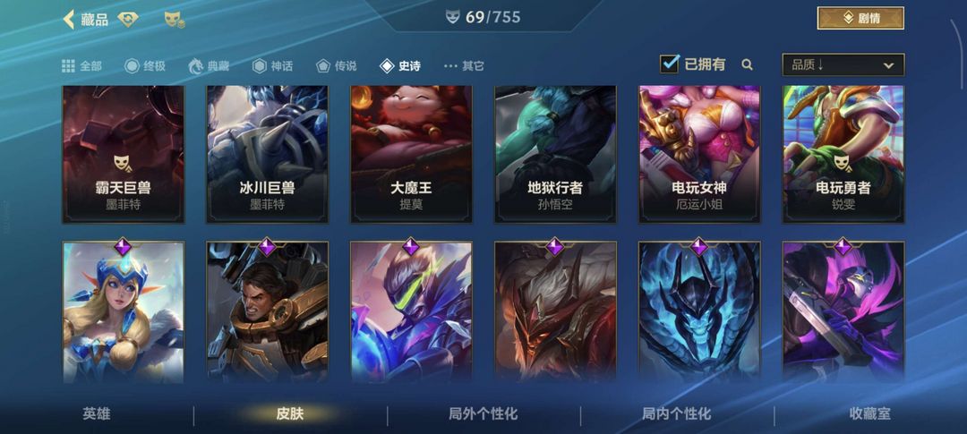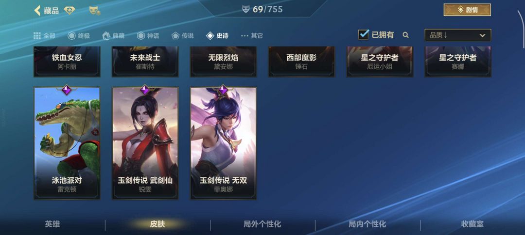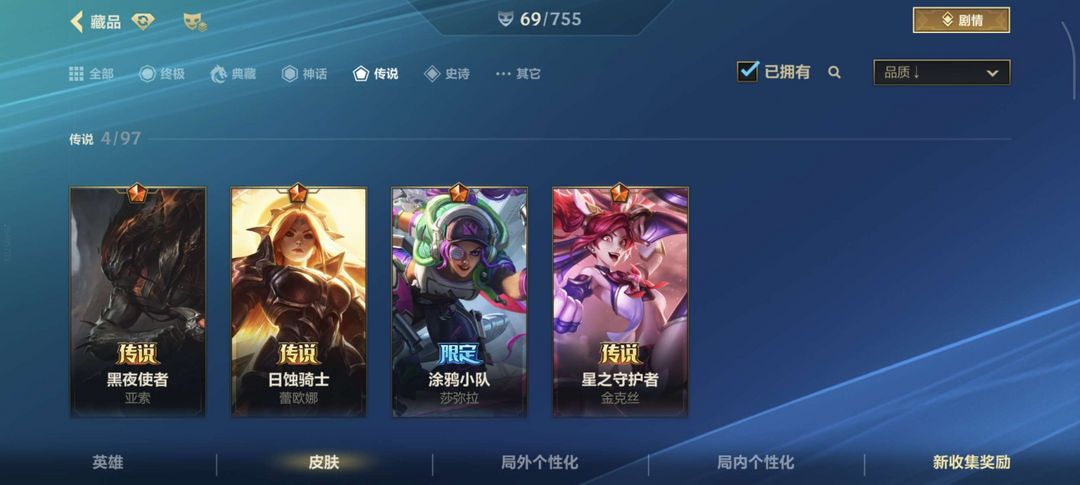 四个传说,29个史诗,射手基本都有皮肤,有的还有好几个