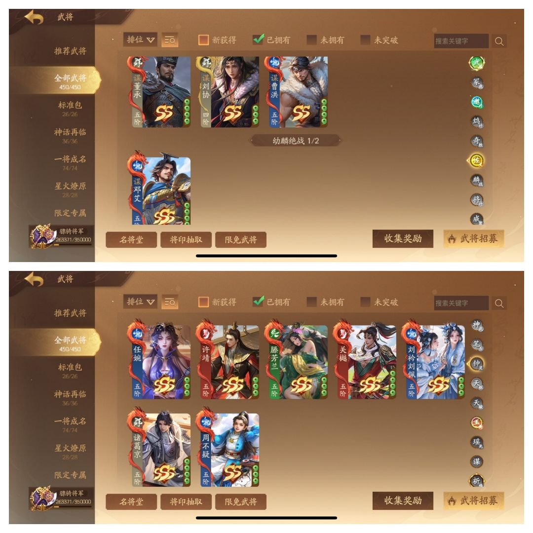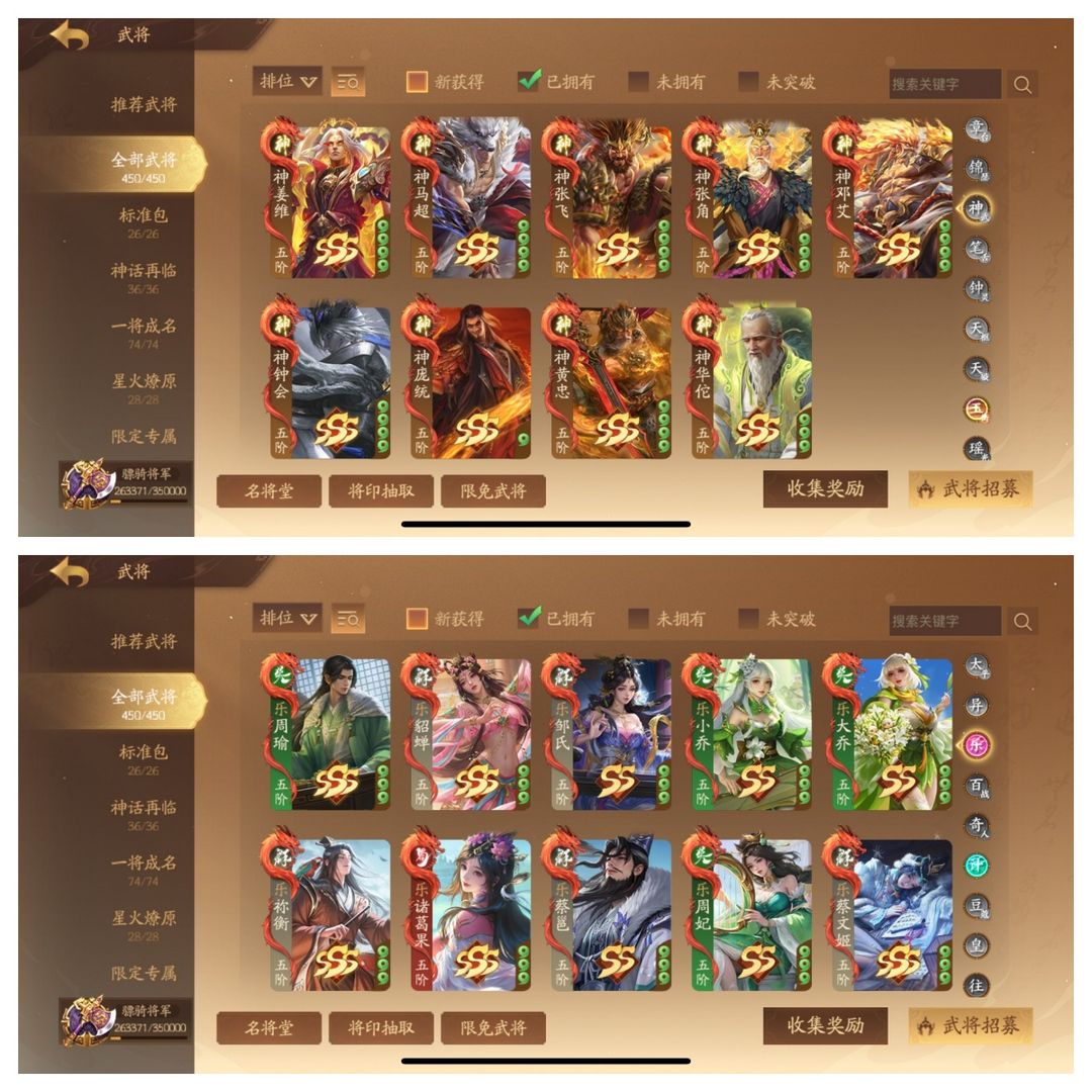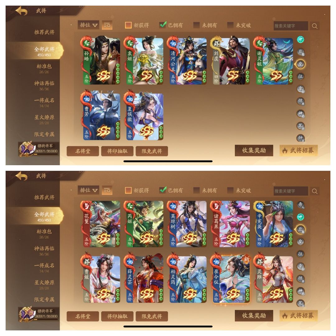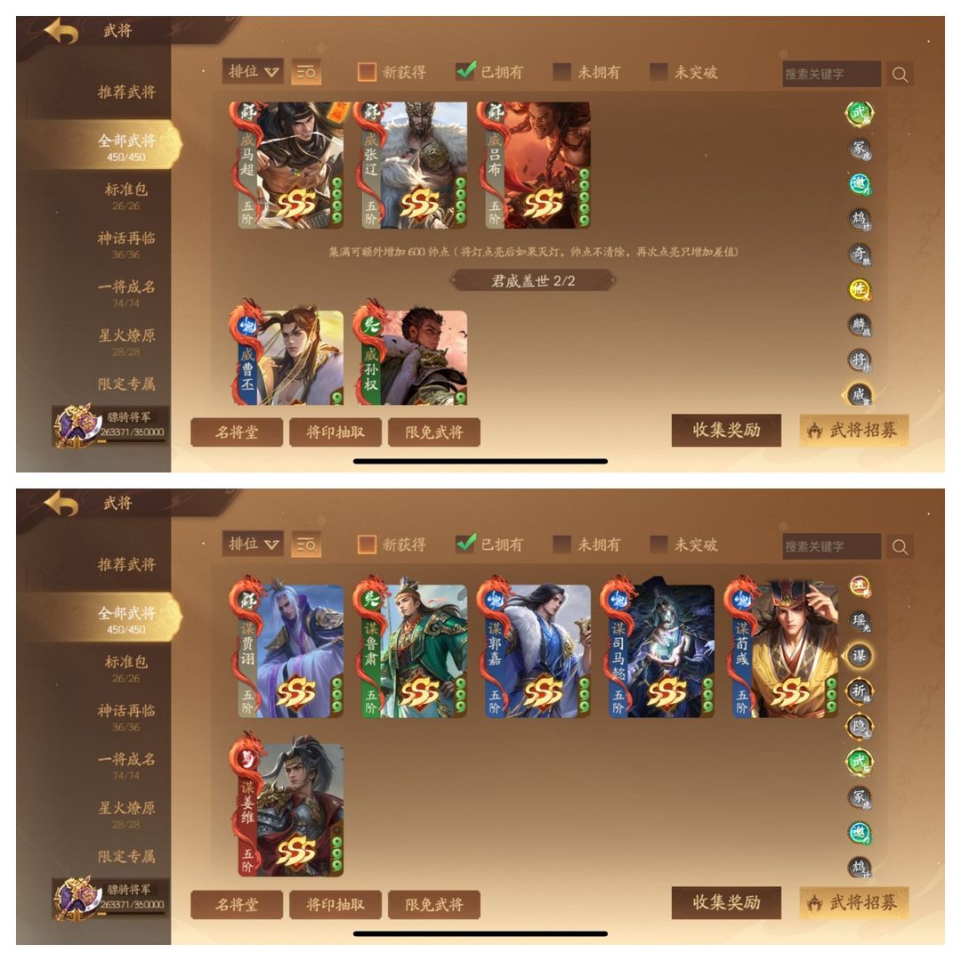 骠骑将军 510将4武庙9神武6大谋17谋10乐5威100阴间7星河【武庙】:武诸葛亮千古传,武陆逊神秀传,武关羽武义传,武皇甫嵩【神武】:神张飞,神张角,神邓艾,神华佗,神黄忠,神姜维,神马超,神钟会,神庞统动【大谋】:谋姜维,谋司马懿双形态动,谋郭嘉,谋贾诩,谋荀彧,谋鲁肃【谋】:谋邓艾,谋司马师,谋关平, 谋典韦,谋胡车儿,谋沮授,谋董承,谋曹洪,谋刘协,谋王凌,谋曹爽,谋诸葛瑾【乐】:乐蔡文姬(动),乐祢衡,乐诸葛果,乐大乔,乐小乔,乐貂蝉,乐周瑜,乐周妃,乐蔡邕,乐邹氏【威】:威马超,威曹丕,威张辽,威吕布,威孙权 ;其他:夏侯玄;关樾;许靖,孙翎鸾,藤芳兰,诸葛京 曹芳动;刘衿刘佩,柳婒 任婉 曹金玉,柏灵筠 薛灵雲动;崔令仪;许劭动, 黄舞蝶,曹媛; 周宣动;和尚;朱建平,丁尚涴,孙霸,SP甄姬,钟毓, 关宁, 莫琼树,夏侯徽 庞会,张曼成,黄舞蝶;吴质,朱铄,刘巴,曹宪 陈珪动, 文钦, 凌操,吕据,孙桓,袁姬,谢灵毓,甘糜夫人,吴普,乐綝,周不疑,孙礼,宣公主,马钧,张奂;庞宏;袁胤;刘晔焚焰动;诸葛均;庞会 张怀;张嫙动;清河公主;星曹仁星法正星董卓星袁术星文丑等各