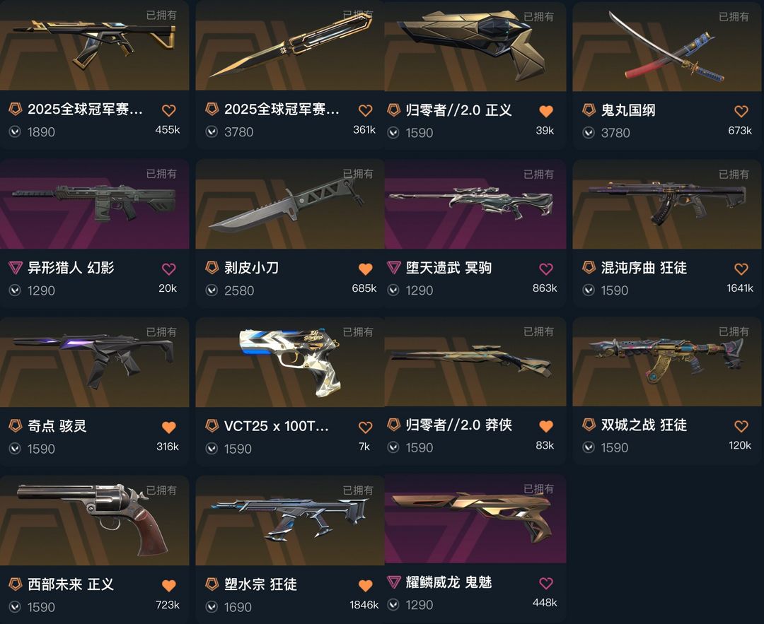 可排★25冠军套★塑水宗双城之战混沌★西部未来★堕天遗武冥狙★剥皮小刀鬼丸太刀★vct标配威龙鬼魅