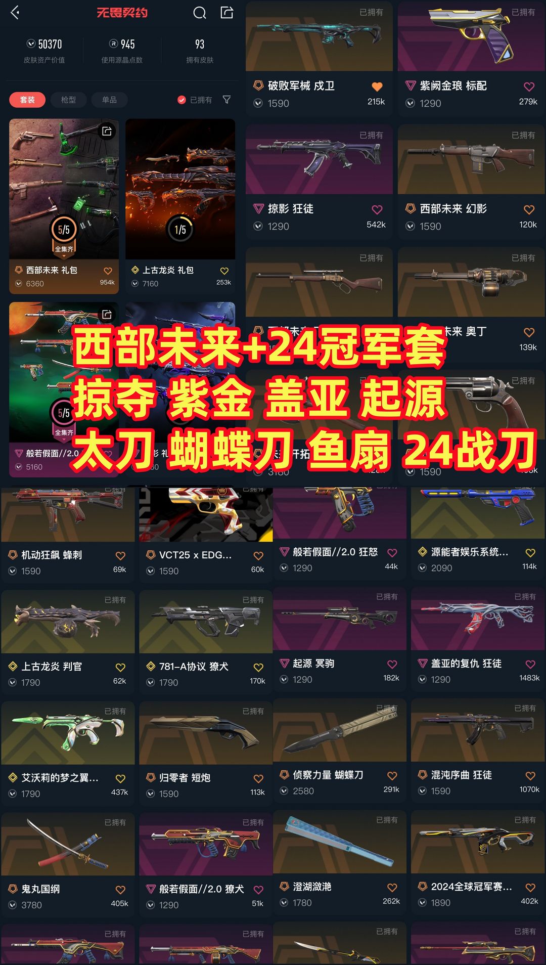 可排✅西部未来⚡24冠军套⚡般若太刀⚡掠夺⚡混沌⚡紫金⚡盖亚⚡破败⚡VCT25标配⚡起源⚡艾沃莉