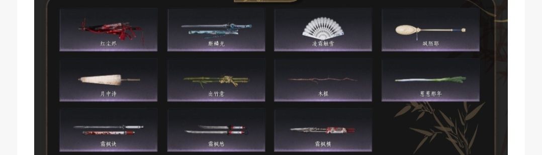 武器外观:飒陌耶/霜枫诀/霜枫愁/霜枫横/木棍/葱葱那年/出竹意/月中诗/凌霜触雪/红尘烬/断鳞光