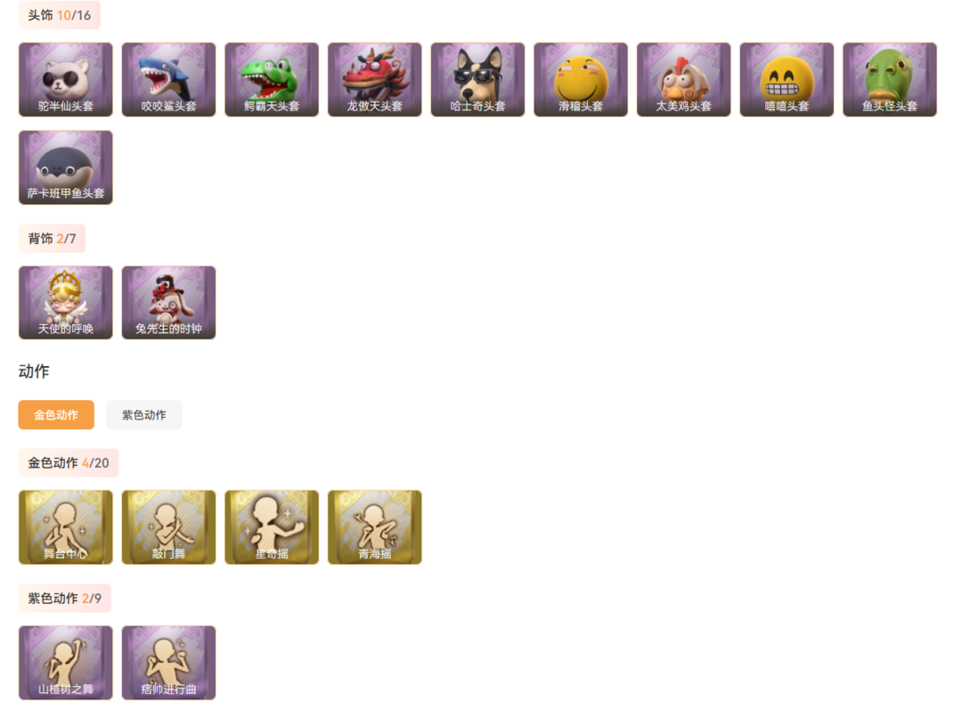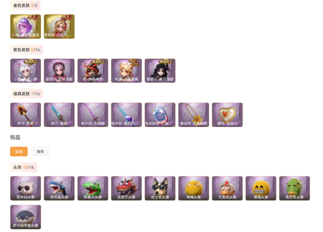皮肤:小黄-遗失的童话,爱丽丝-血色中的玛丽,小黄-青丘一梦、霓裳踏雪、罗丽,爱丽丝-丝缕哀歌、瑞羽衔春、绣春逍影、冰公主、泽引山海、水王子,薇薇安-黑月挽歌,零-赤炼将军、青云逸歌,阿念-灵昭鹿鸣、王子与骑士;饰品:头饰-鳄霸天头套,头饰-咬咬鲨头套,头饰-驼半仙头套,头饰-太美鸡头套,头饰-龙傲天头套,头饰-鱼头怪头套,头饰-哈士奇头套,头饰-嘻嘻头套,头饰-滑稽头套,头饰-萨卡班甲鱼头套,背饰-天使的呼唤,背饰-兔先生的时钟;道具:铲子-焰骨,桃木剑-永眠曲,桃木剑-最后的独角兽,刺刀-青瓷,传送按钮-幻宠之门,摸金符-花落精绝,腰包-宝剑八;动作:动作-星奇摇,动作-青海摇,动作-舞台中心,动作-敲门舞,动作-山楂树之舞,动作-痞帅进行曲;工牌:工牌-点点萌伴,工牌-圣光之誓,工牌-蓝海奇遇,工牌-童话扉页