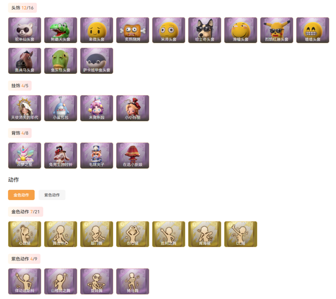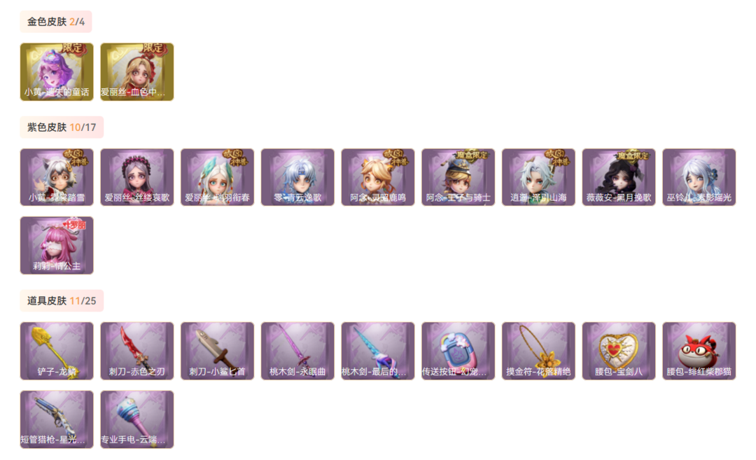 皮肤:小黄-遗失的童话,爱丽丝-血色中的玛丽,小黄-霓裳踏雪,逍遥-泽引山海,爱丽丝-丝缕哀歌,爱丽丝-瑞羽衔春,薇薇安-黑月挽歌,零-青云逸歌,巫铃儿-素影瑶光,阿念-王子与骑士,阿念-灵昭鹿鸣,莉莉-情公主;饰品:头饰-炙热烧烤,头饰-鳄霸天头套,头饰-驼半仙头套,头饰-鱼头怪头套,头饰-面具马头套,头饰-烈焰红唇头套,头饰-哈士奇头套,头饰-嘻嘻头套,头饰-滑稽头套,头饰-呆滞头套,头饰-卑微头套,头饰-萨卡班甲鱼头套,背饰-毛球夹子,背饰-云梦之星,背饰-在逃小新娘,背饰-兔先生的时钟,挂饰-小鲨包包,挂饰-天使消失的年代,挂饰-未竟乐园,挂饰-小小玛丽;道具:铲子-龙鳞,桃木剑-永眠曲,桃木剑-最后的独角兽,刺刀-小鲨匕首,刺刀-赤色之刃,传送按钮-幻宠之门,摸金符-花落精绝,腰包-宝剑八,腰包-绯红柴郡猫,短管猎枪-星光的裁决,专业手电-云端梦想计划;动作:动作-DL摇,动作-伤心摇,动作-舞台中心,动作-胜利之舞,动作-青海摇,动作-心跳摇,动作-敲门舞,动作-骑马舞,动作-旋转舞,动作-山楂树之舞,动作-律动迪斯科