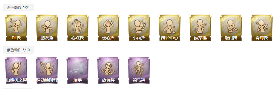 【动作】鸳鸯戏、鹏友摇、DL摇、姬芽摇、心跳摇、伤心摇、青海摇、敲门舞、小雨摇、舞台中心、骑马舞、律动迪斯科、旋转舞、山楂树之舞