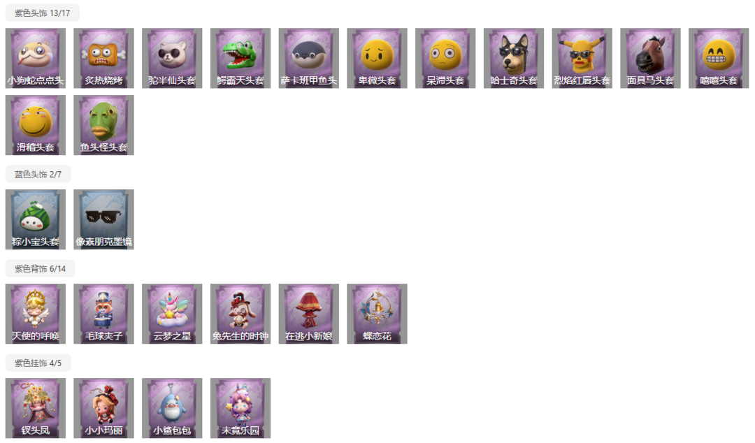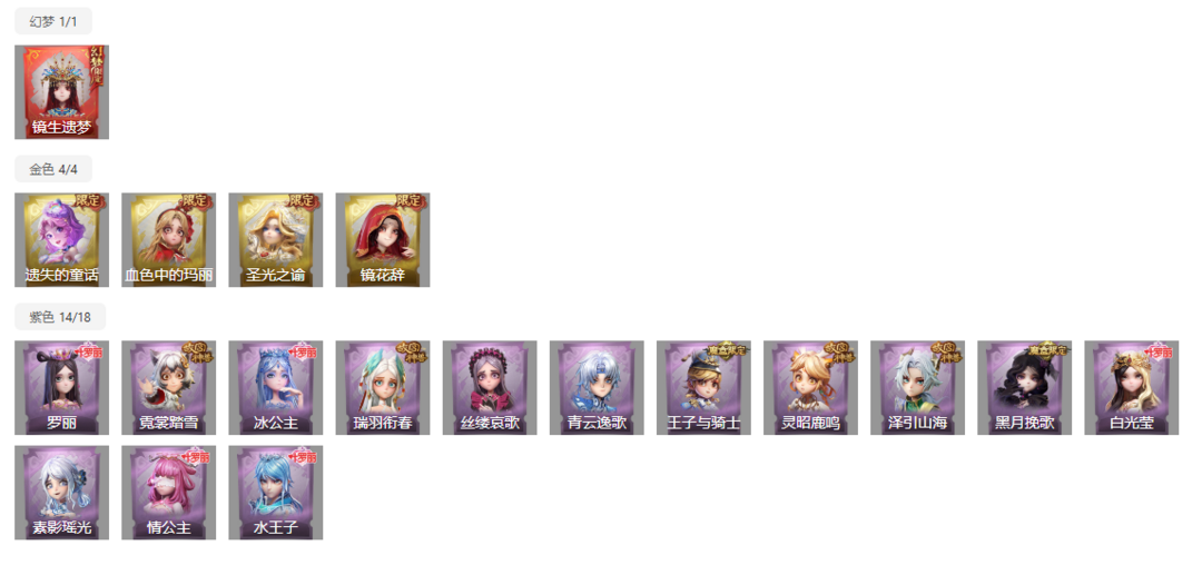 【紫色皮肤】呱呱雨衣、迷途僵宝、绣春逍影、除妖小师妹、素影瑶光、王子与骑士、灵昭鹿鸣、白光莹、黑月挽歌、青云逸歌、泽引山海、冰公主、丝缕哀歌、瑞羽衔春、罗丽、霓裳踏雪、情公主、水王子