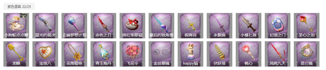 【道具皮肤】小鲨匕首、赤色之刃、圣心之泪、龙鳞、凤鸣九天、永眠曲、最后的独角兽、小狗蛇点点鞭、昆仑镜、幻宠之门、祝祷词、花落精绝、宝剑八、绯红柴郡猫、星光的裁决、云端梦想计划、伏妖塔、青玉抱丹、飞花令、金丝眼镜、happy猫、桃心、紫霄、飞天绫、晶澜灵翼、