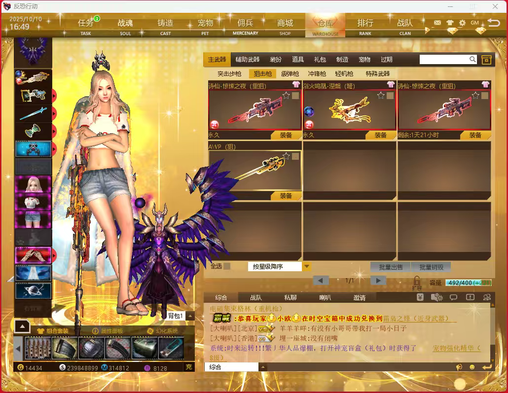 长庚,双紫薇,双暗刀,双北洛,惊悚之夜,p90,炎阳套,冰凤套,狂徒,死亡信使,54级后羿,其他8.5若干,只写热门常玩的(实则杂七杂八东西太多了,懒得写,看图就行)