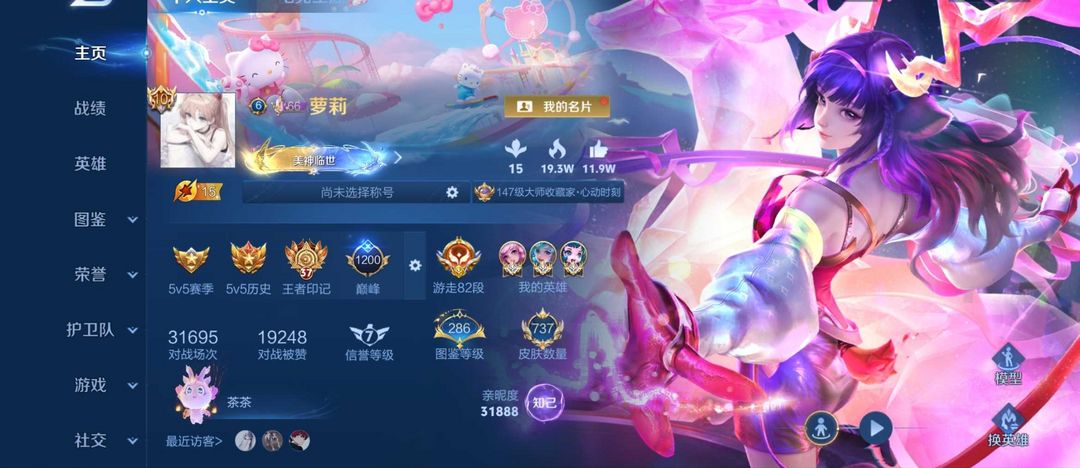 历史在榜全国第一 瑶+朵莉亚+蔡文姬 上赛季上巅峰第一 最新蛇年也买了 723皮+17 星传说绿巧黑孔雀,满传说满满无双满天幕 满按键 全满,库洛米全套天幕+全部无双至尊皮肤+永久四传说灵宝+超多局内动作表情特效+龙年贵族邀请+血条皮肤+典藏小兵皮肤 随游戏更新补齐皮肤按键+超多星史诗+全套KPL比赛史诗星元不确认游戏,消极比赛毁号,涉及毁坏虚拟财产罪及计算机安全罪,请文明游戏素质游戏,让我们共建美好租号平台>>>>>> 本游戏账号: V10荣耀贵族用户,基础段位:最强王者,英雄虽然少,应该有你喜欢的英雄。,皮肤目前不多,希望有你喜欢的。1 注意事项: A.游戏过程中请不要恶意挂机或者不文明发言;B.恶意挂机、顶号等行为将被拉黑无法再次下单;C.进入游戏后中途请勿退出登陆,否则无法再
