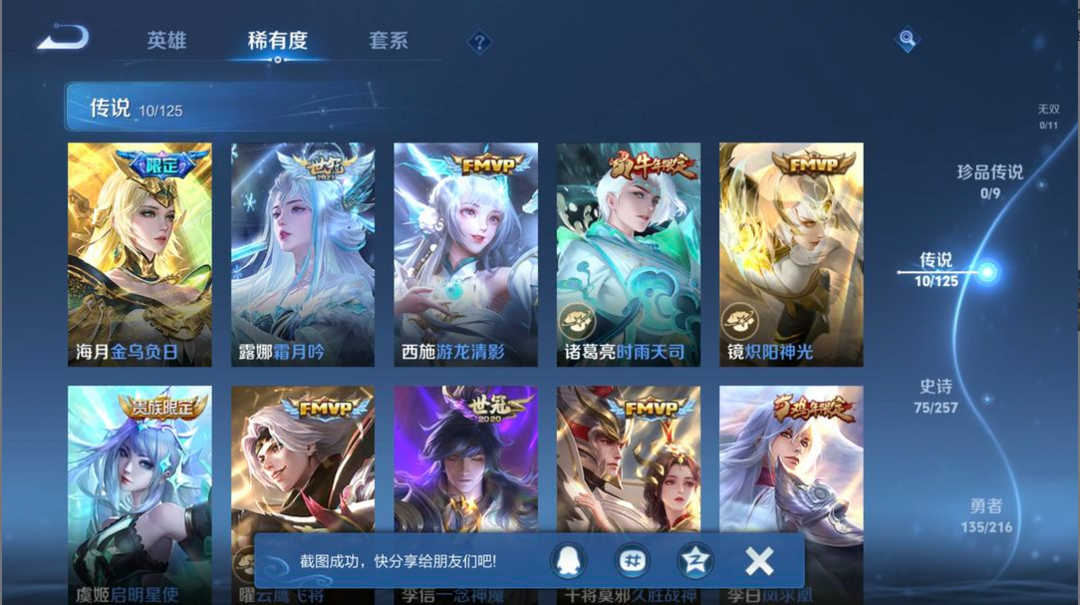 本游戏账号: V10用户,基础段位:永恒钻石IV,英雄多,皮肤多。典藏皮肤3个,感受典藏皮肤带来的优质体验快感,FMVP皮肤5个,尽情享受FMVP皮肤带来的主角光环, 私人所属英雄皮肤有:夏侯惇 无限飓风号||花木兰 九霄神辉||孙悟空 全息碎影诸葛亮 鹤羽星尊||诸葛亮 武陵仙君||澜 电玩·雷克斯||李白 凤求凰||马可波罗 妄想实况||狄仁杰 超时空战士||达摩 黄金狮子座||武则天 海洋之心||关羽 武圣||貂蝉 仲夏夜之梦||艾琳 觅芳踪||孙悟空 地狱火||后羿 黄金射手座||虞姬 启明星使||虞姬 云霓雀翎||杨戬 永曜之星||赵云 淬星耀世||李信 一念神魔,等等