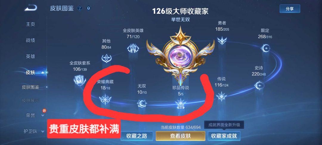 本游戏账号: V10用户,基础段位:最强王者,英雄多,皮肤多。典藏皮肤18个,感受典藏皮肤带来的优质体验快感,FMVP皮肤12个,尽情享受FMVP皮肤带来的主角光环, 私人所属英雄皮肤有:程咬金 活力突击||诸葛亮 星域神启||孙悟空 全息碎影||孙尚香 杀手不太冷||铠 银白咏叹调||关羽 赤影疾锋||夏侯惇 无限飓风号||伽罗 最初的交响||鲁班七号 星空梦想||瑶 拾光映像||貂蝉 幻阙歌||李白 鸣剑·曳影||花木兰 九霄神辉||韩信 弑枪猎影||虞姬 神鉴启示录||芈月 大秦宣太后||小乔 天鹅之梦||武则天 倪克斯神谕,等等