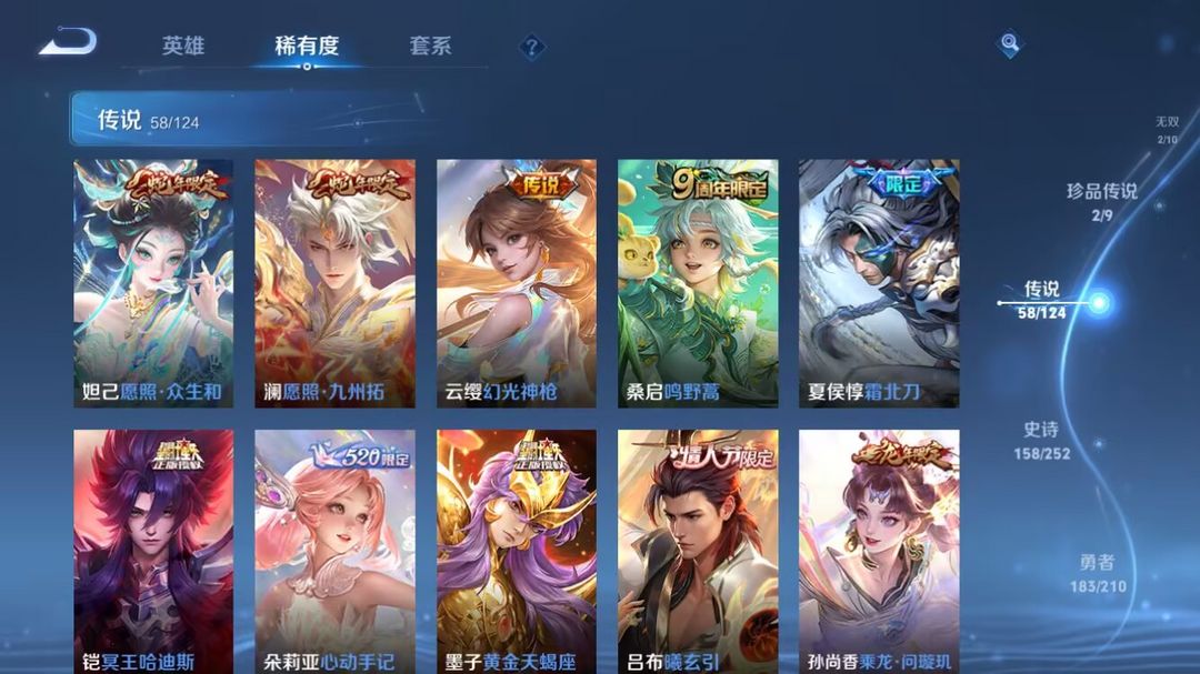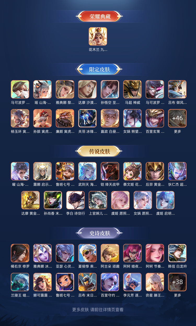 [传说皮肤]:艾琳-觅芳踪/鲁班七号-寅虎·瑞焰/裴擒虎-寅虎·赤拳/马可波罗-妄想实况/蔡文姬-花朝如约/马超-无双飞将/铠-绛天战甲/杨玉环-星之鸣奏/武则天-海洋之心/上官婉儿-妄想奇谈/女娲-愿照·千秋盛/云缨-幻光神枪/虞姬-愿照·岁时盈/桑启-鸣野蒿/刘备-时之恋人/澜-逐花归海/狄仁杰-超时空战士/诸葛亮-鹤羽星尊/曜-山海·苍雷引/吕布-怒海麟威/李白-诗剑行/不知火舞-绯月行/露娜-启示之音/虞姬-启明星使/达摩-黄金狮子座/镜-炽阳神光/孙尚香-末日机甲/花木兰-冠军飞将/后羿-黄金射手座/曜-云鹰飞将/百里玄策-白虎志/干将莫邪-久胜战神/西施-游龙清影