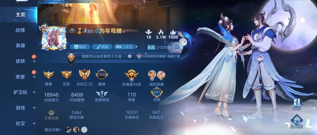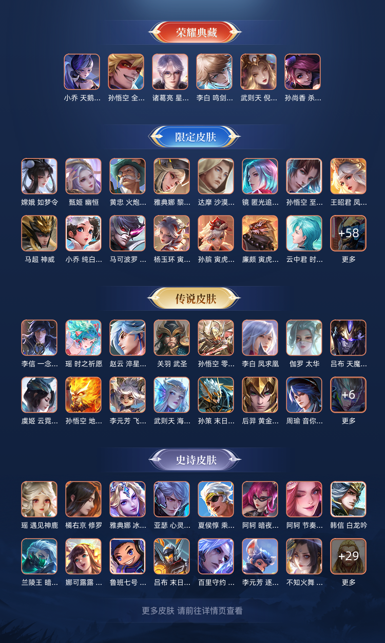 本游戏账号: V10用户,基础段位:至尊星耀IV,英雄多,皮肤多。典藏皮肤6个,感受典藏皮肤带来的优质体验快感,FMVP皮肤6个,尽情享受FMVP皮肤带来的主角光环, 私人所属英雄皮肤有:诸葛亮 星域神启||孙尚香 杀手不太冷||李白 鸣剑·曳影||武则天 倪克斯神谕||孙悟空 全息碎影||小乔 天鹅之梦梦奇 胖达荣荣||孙尚香 异界灵契||孙尚香 末日机甲||孙策 末日机甲||吕布 天魔缭乱||周瑜 音你心动||宫本武藏 地狱之眼||李白 凤求凰||狄仁杰 超时空战士||武则天 海洋之心||关羽 武圣||貂蝉 仲夏夜之梦||孙悟空 零号·赤焰||孙悟空 地狱火||后羿 黄金射手座||李元芳 飞鸢探春||虞姬 启明星使||虞姬 云霓雀翎||裴擒虎 寅虎·赤拳||赵云 淬星耀世||瑶 时之祈愿||李信 一念神魔||伽罗 太华,等等