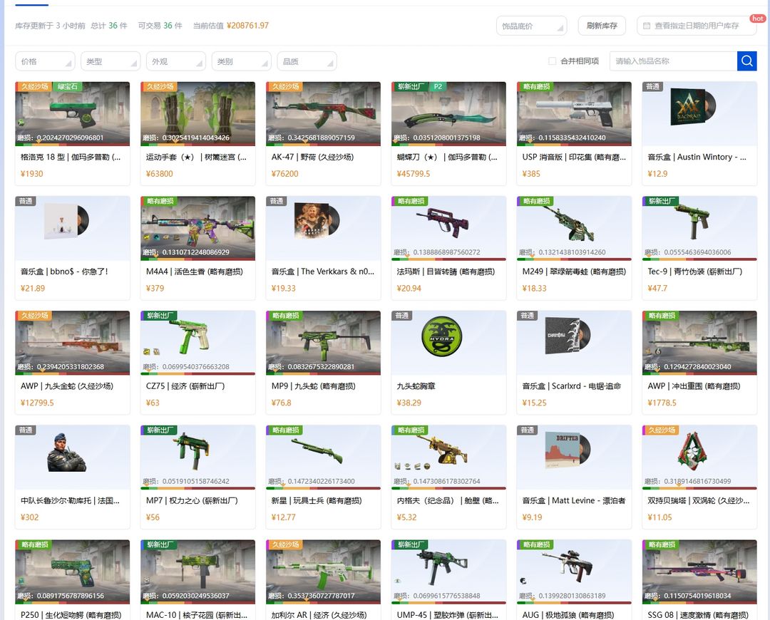 可完美/5e/21w库存伽马绿蝴蝶刀/酒精树篱迷宫手套/酒精野荷AK/九头蛇狙/印花集USP